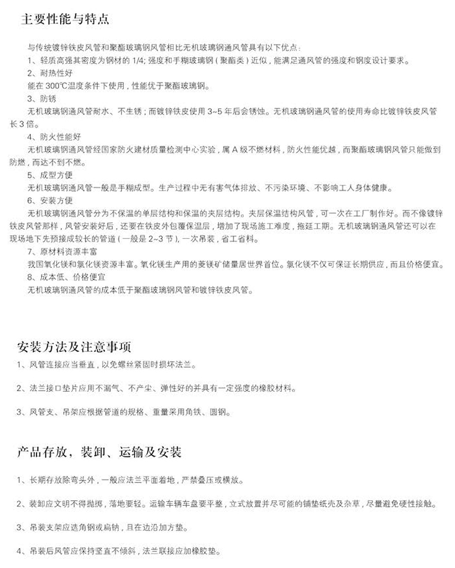 玻鎂復合風管板材表面光滑、平整,漏風率僅為一般風管的5%,大大提高了空氣輸送效率。在生產、制作、安裝、使用此產品過程中,玻鎂復合風管均不生產對環境有害的物質,不生銹、不發霉、不積塵,無玻璃纖維風管的粉塵和纖維;無異味,導熱系數低,保溫性能極佳,具有良好的隔音、吸音性能,無鐵皮風管收縮和擴張時產生的噪音;不燃、抗折、耐壓、吸水率小、溫膨脹低,無吸潮變形現象,使用壽命長達20年。玻鎂風管作為普及型產品不僅滿足了市場對傳統產品的需求,同時,通過提高無機復合材料的節能、防火和環保指標參數,實現了無機復合風管的性能升級。此產品已通過“國家防火建筑材料質量監督檢驗中心型式檢驗”,“國家建筑材料測試中心型式檢驗”,獲得了“建材燃燒性能等級(GB8624A級)標識”。 玻鎂風管可用作于各類暖通空調通風管,防排煙風管等。與傳統無機復合風管比較,玻鎂復合風管具有顯著的性價比優勢,市場前景廣闊。