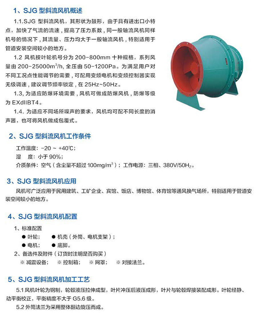 斜流風(fēng)機又名混流風(fēng)機,是介于軸流風(fēng)機和離心風(fēng)機之間的風(fēng)機,斜流風(fēng)機的葉輪讓空氣既做離心運動又做軸向運動,殼內(nèi)空氣的運動混合了軸流與離心兩種運動形式。斜流風(fēng)機主要部件為:電機、葉輪、外筒、內(nèi)筒、導(dǎo)葉、底腳等等. 配套部件;斜流風(fēng)機消音器,有效解決噪音問題,具有壓力高、風(fēng)量大、高效率、結(jié)構(gòu)緊湊、噪音低、體積小、安裝方便等。