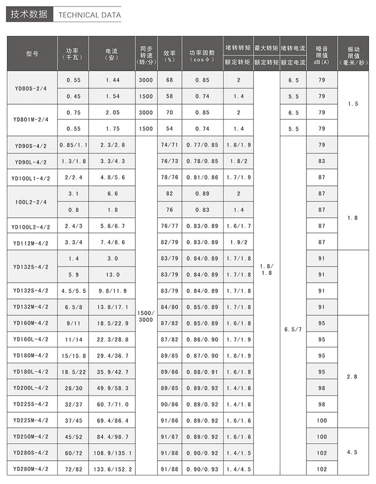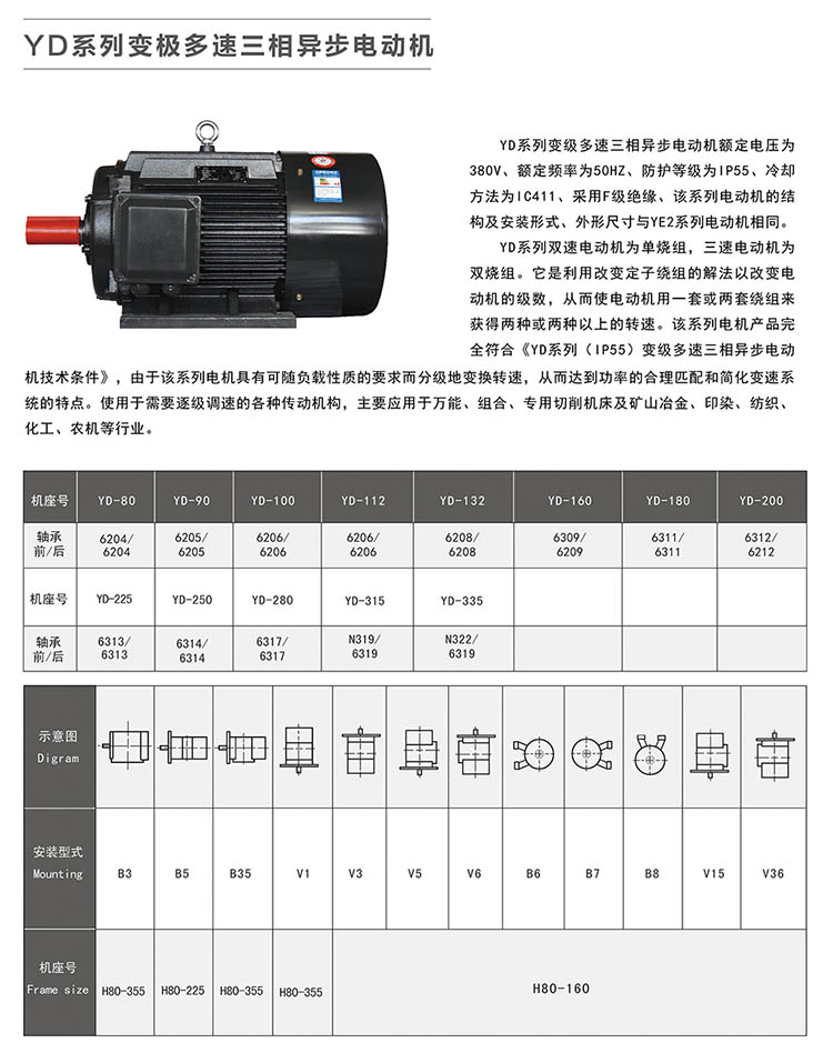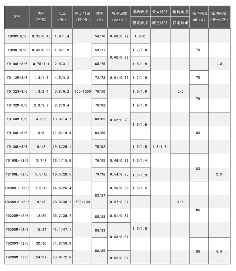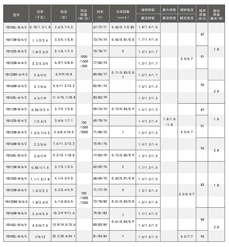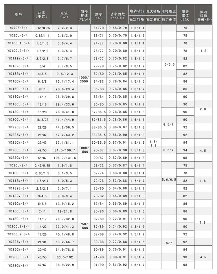 YD系列變極多速三相異步電動(dòng)機(jī)額定電流為380V、額定頻率為50HZ、防護(hù)等級(jí)為IP44、冷卻方法為IC411、采用B級(jí)絕緣,該系列電動(dòng)機(jī)的結(jié)構(gòu)及安裝形式、外形尺寸與Y系列電動(dòng)機(jī)相同。 YD系列雙速電動(dòng)機(jī)為單繞組,三速電動(dòng)機(jī)為雙繞組。它是利用改變定子繞組的接法以改變電動(dòng)機(jī)的級(jí)數(shù),從而使電動(dòng)機(jī)用一套或兩套繞組來(lái)獲得兩種或兩種以上的轉(zhuǎn)速。該系列電動(dòng)機(jī)產(chǎn)品完全符合《YD系列(IP44)變極多速三相異步電動(dòng)機(jī)技術(shù)條件》,由于該系列電機(jī)具有可隨負(fù)載性質(zhì)的要求而分級(jí)地變換轉(zhuǎn)速,從而達(dá)到功率的合理匹配和簡(jiǎn)化變速系統(tǒng)的特點(diǎn)。適用于需要逐級(jí)調(diào)速的各種傳動(dòng)機(jī)構(gòu),主要應(yīng)用于很多、組合、專用切削機(jī)床及礦山冶金、紡織、印染、化工、農(nóng)機(jī)等行業(yè)。