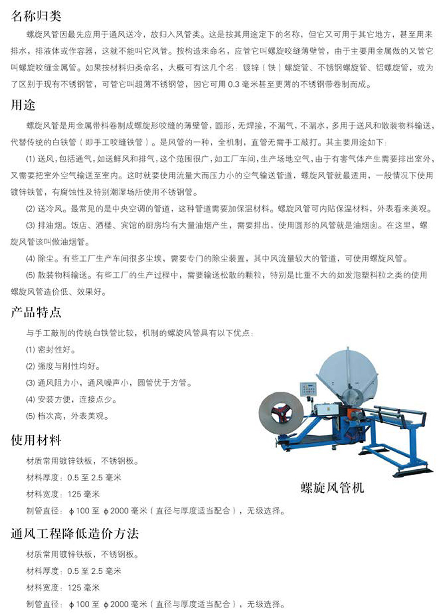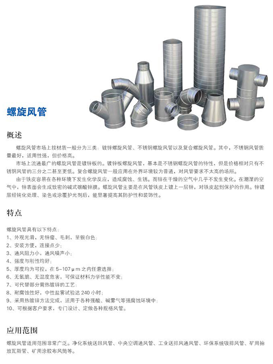 螺旋風管具有以下特點: 1、外觀光滑,無鋅瘤、毛刺,呈銀白色; 2、安裝方便,連接點少; 3、通風阻力小,通風噪聲小; 4、強度與剛性均好; 5、厚度均為可控,在5-107μm之內任意選擇; 6、無氫脆、無溫度危害,可保證材料力學性能不變; 7、可代替部分需熱鍍鋅的工藝; 8、耐腐蝕性好; 9、采用熱鍍鋅方法完成,適用于各種強酸、堿霧氣等強腐蝕環境中; 10、可根據客戶要求,專門設計、定做各種規格風管。