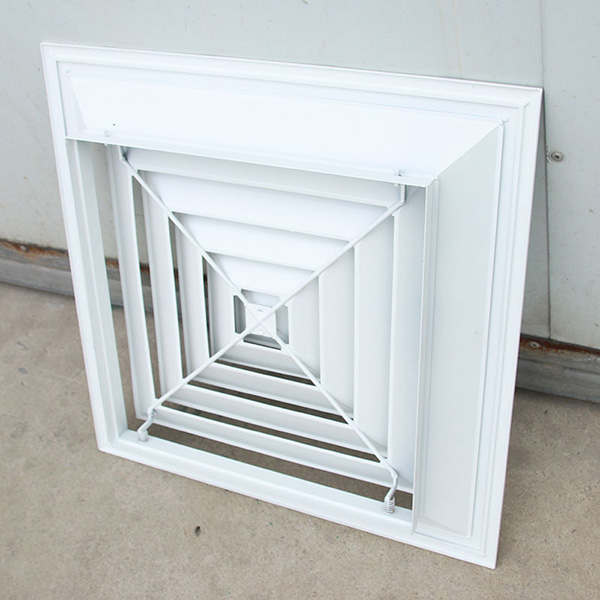 方形散流器(鋁合金散流器)優點及適用范圍:氣流屬貼附(平送)型,適用于播音室、醫院、劇場、教室、音樂廳、圖書館、游藝廳、劇場休息廳、一般辦公室、商店、旅館及體育館等。為了使人們在各種環境下避免噪音的干擾以及不適感,除了按性能表確定頸部風速外,還需要考慮安裝高度及安裝場合。方型散流器使用該類型散流器時要與調節閥配合使用,才能在系統中得到理想的氣流分布。此風口的葉片角度為固定式,不能隨意調節,整個葉片與邊框采用分離結構 (即葉片可以從邊框內取下,安裝好邊框后再裝上葉片),以方便安裝與調節。