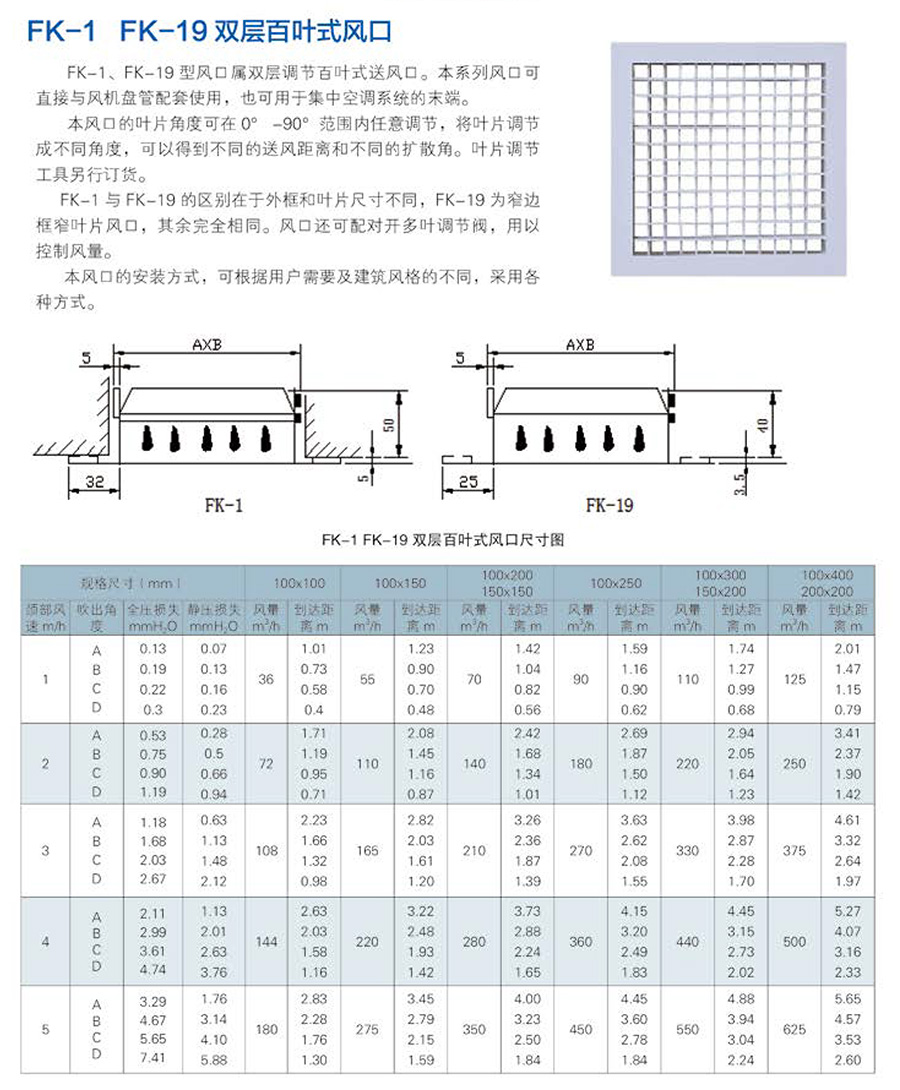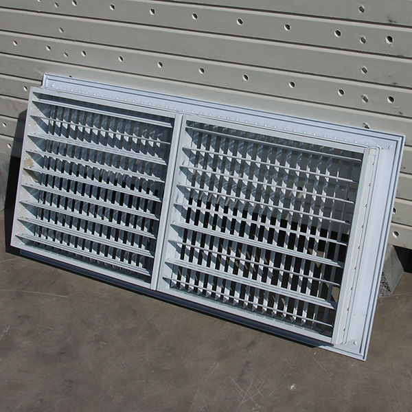 雙層百葉風口,廣泛應用于空調系統中作送風口,根據使用要求,風口后面可配制鋁制風量調節閥(人字閘),雙層百葉風口具有兩層相互垂直頁片調節水平和垂直頁片的角度,調整氣流擴散面,以改變射程,風口的外框寬度有寬邊框和窄邊框兩種,可用于特殊要求的通風系統中。