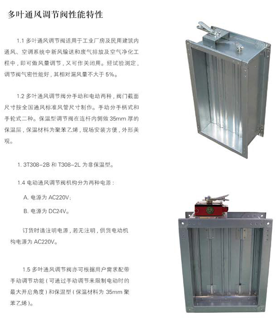 安裝在空調、通風系統的風管上,用來調節支管的風量,也可用于新風與回風的混合調節。