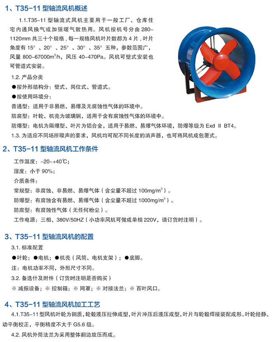 1、T35軸流風機的葉輪:由葉片和輪轂組成,葉片均采用薄鋼板制成,且按選定之安裝角焊于輪轂上。