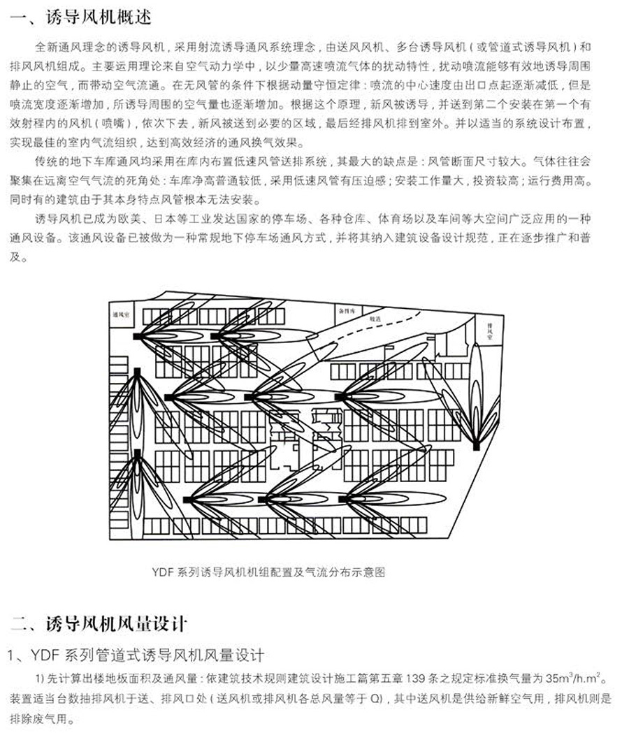 YDF系列誘導(dǎo)風(fēng)機(jī)根據(jù)用戶不同的需要可分為兩種類型,即YDF-A系列管道式誘導(dǎo)風(fēng)機(jī)和YDF-B系列多風(fēng)機(jī)式誘導(dǎo)風(fēng)機(jī),管道式誘導(dǎo)風(fēng)機(jī)由高壓風(fēng)機(jī)、 小口徑螺旋風(fēng)管和噴嘴組成;多風(fēng)機(jī)式誘導(dǎo)風(fēng)機(jī)由臺(tái)超薄型風(fēng)機(jī)和噴嘴組成。 傳統(tǒng)的地下車(chē)庫(kù)通風(fēng)均采用在庫(kù)內(nèi)布置低速風(fēng)管送排風(fēng)系統(tǒng),其最大的缺點(diǎn)是:風(fēng)管斷面尺寸較大,氣體往往會(huì)聚集在遠(yuǎn)離空氣氣流的死角處;車(chē)庫(kù)凈高普通較低,采用低速風(fēng)管有壓迫感;安裝工作量大,投資較高;運(yùn)行費(fèi)用高。同時(shí)有的建筑由于其本身特點(diǎn)風(fēng)管根本無(wú)法安裝。 誘導(dǎo)風(fēng)機(jī)已成為歐美、日本等工業(yè)發(fā)達(dá)國(guó)家的停車(chē)場(chǎng)、各種倉(cāng)庫(kù)、體育場(chǎng)以及車(chē)間等大空間廣泛應(yīng)用的一種通風(fēng)設(shè)備。該通風(fēng)設(shè)備已被做為一種常規(guī)地下停車(chē)場(chǎng)通風(fēng)方式,并將其納入建筑設(shè)備設(shè)計(jì)規(guī)范,正在逐步推廣和普及。