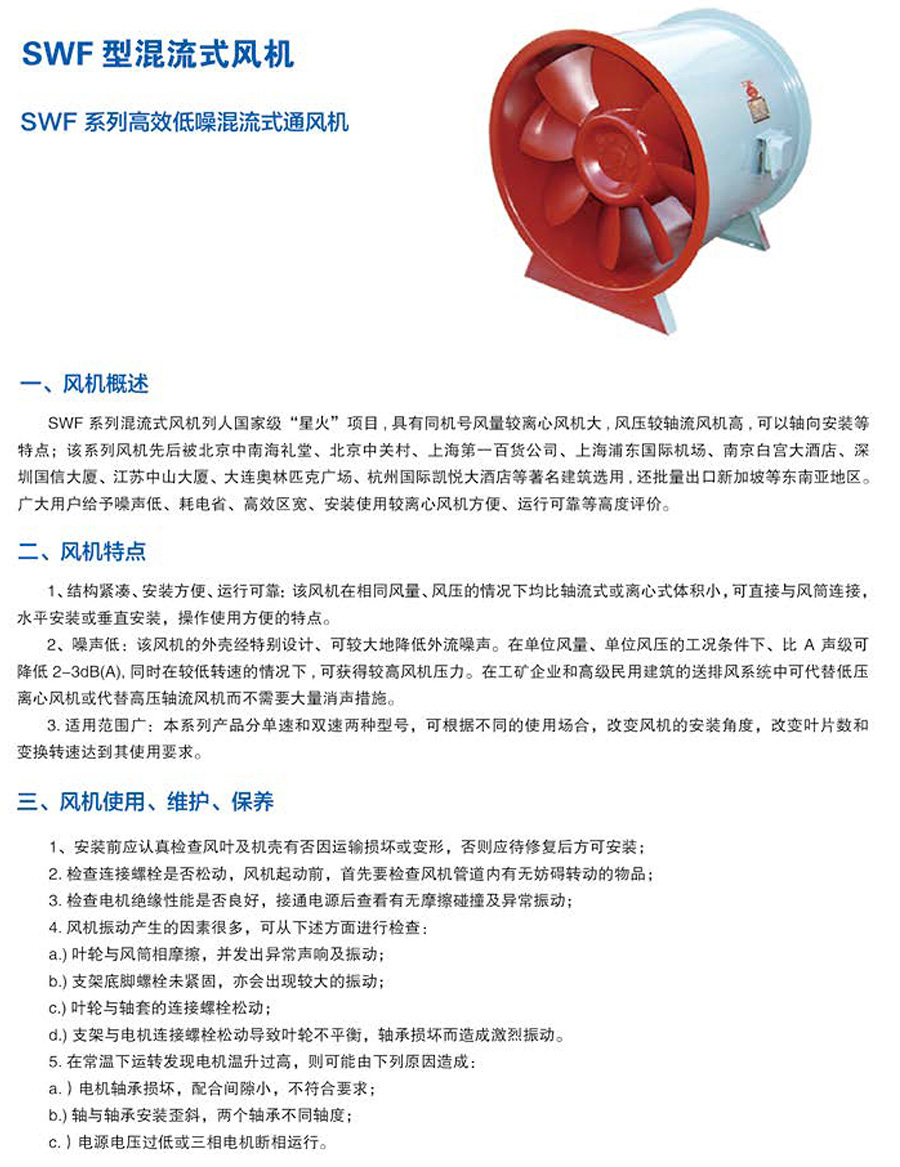 【SWF(B)】系列低噪節(jié)能混流通風機是介于軸流式和離心式通風機之間的一種新型風機,具有離心式風機的高壓力,軸流風機的大流量,效率高,節(jié)能好,噪聲低,安裝方便等特點。風機設計新穎,結構緊湊,體積小,重量輕,易安裝,風機可聯(lián)接管道和安裝在空調箱內。低壓離心風機,廣泛用于工業(yè),民用建筑通風除塵等。HL3-2A系列混流通風機廣泛用于隧道、地下車庫、高級民用建筑、冶金、廠礦等場所的通風換氣及消防高溫排煙,特殊環(huán)境可選用防爆型混流風機。